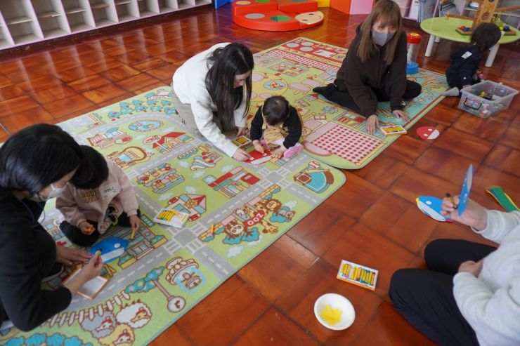 幼児教室です。絵本をお行儀よく聞けてますね。