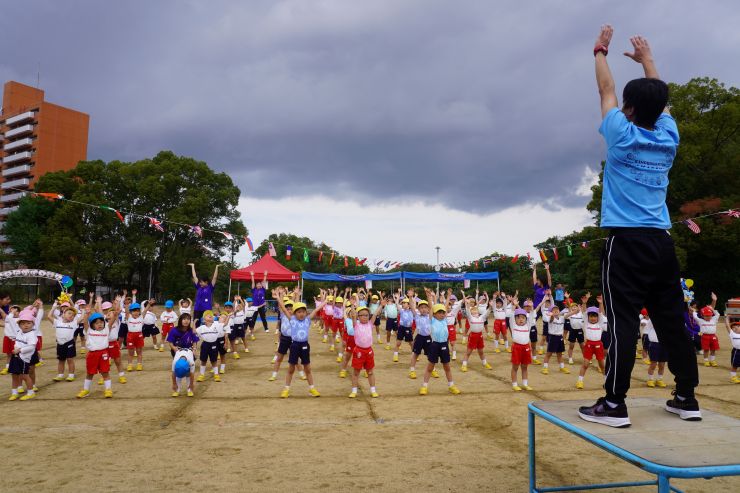 運動会。「ドタバッチョ」で楽しく体をほぐしました。